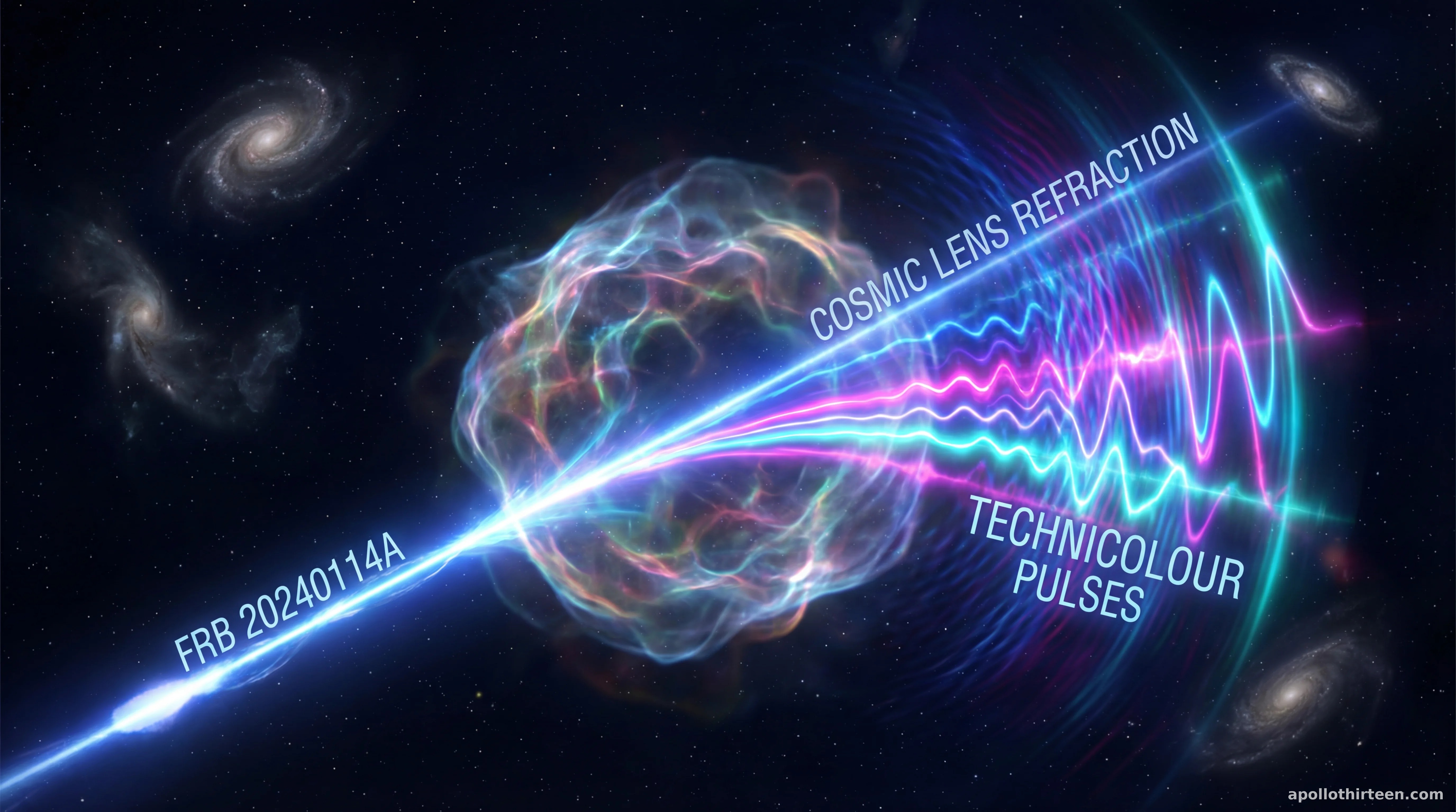 The term "technicolour" refers to the complex spectral patterns observed in the 5,526 repetitions of FRB 20240114A. In these observations, the bursts did not just vary in brightness; they changed their "pitch" or frequency across the radio spectrum. Researchers noted that the central frequency of emission would drift significantly over months, a phenomenon that is difficult to explain through intrinsic source physics alone but is a natural consequence of moving through a clumpy, ionized medium. These shifts are accompanied by orthogonal polarization angle jumps, which serve as a secondary line of evidence for lensing, as different lensed paths probe different magnetic environments within the plasma.