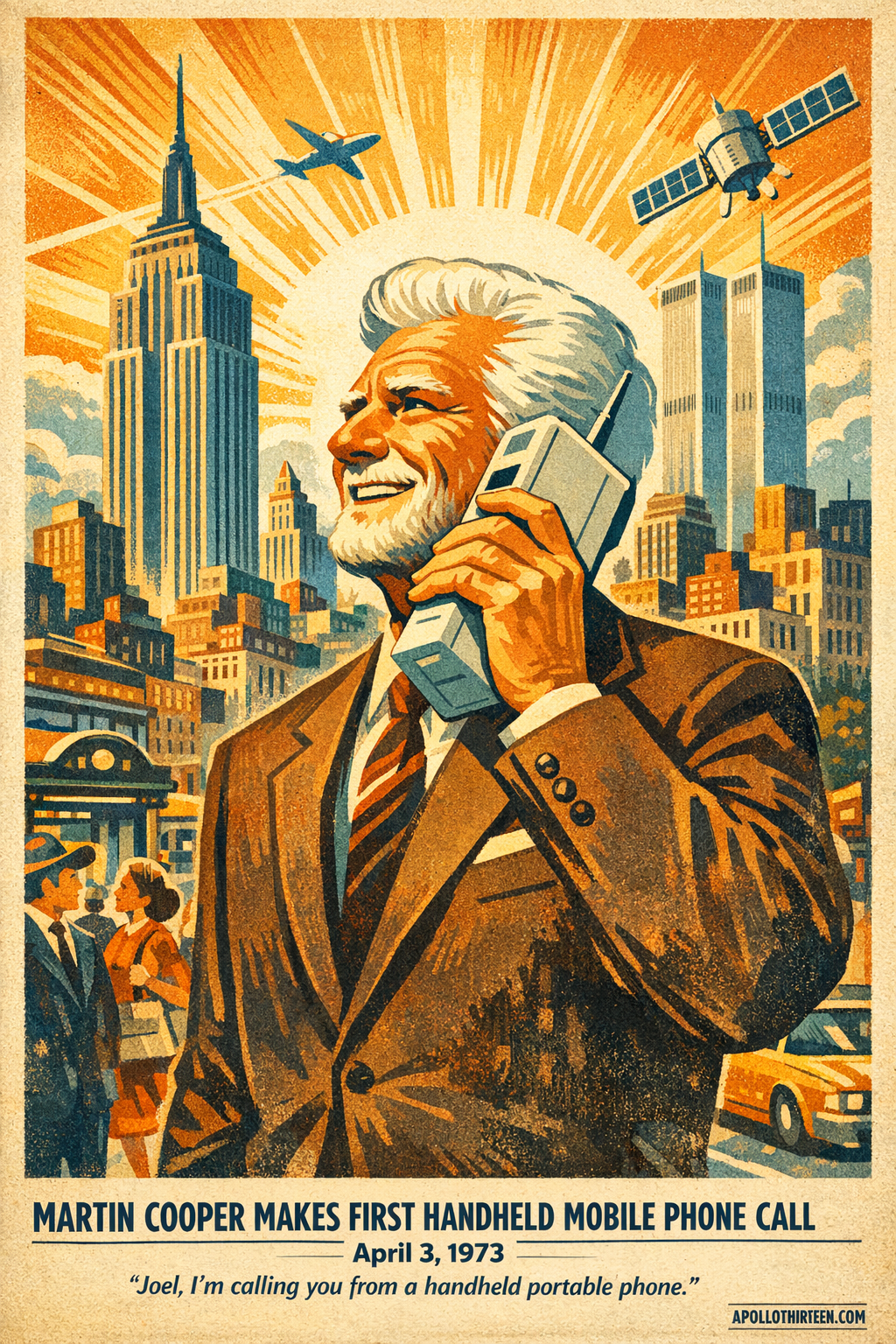 Hoy hace cincuenta y tres años, un hombre con un traje oscuro caminaba por la Sexta Avenida de Manhattan cargando lo que parecía, a primera vista, un pequeño ladrillo. Era una cálida mañana de abril, de esas que hacen que los neoyorquinos aceleren el paso y los taxis se vuelvan aún más frenéticos. Entre las calles 53 y 54, con el ruido y la conmoción de la ciudad como banda sonora, Martin Cooper sacó el dispositivo de su bolsillo, se lo acercó a la oreja y habló a través de unas pocas manzanas de la ciudad hacia el futuro.