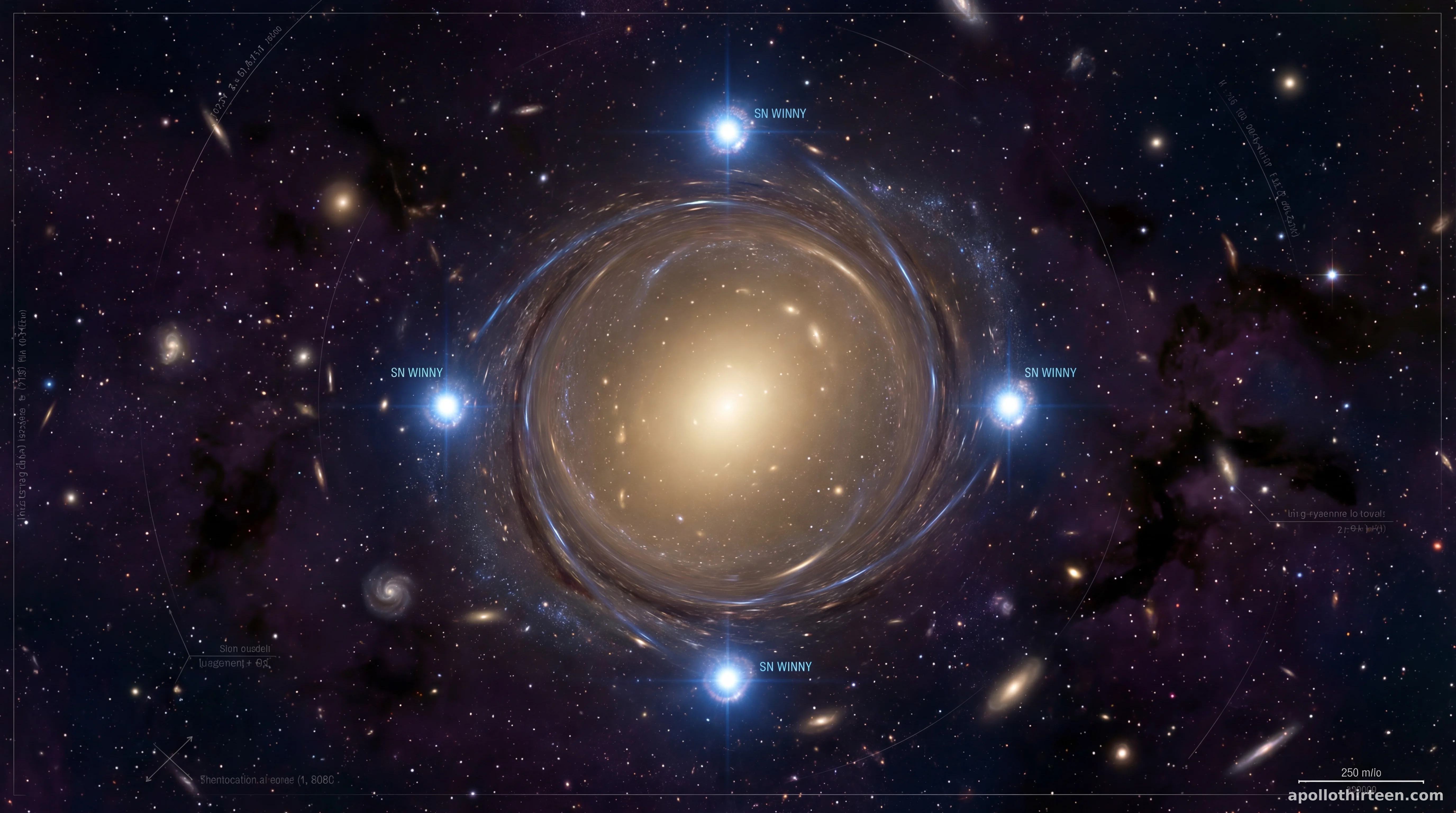 **SN 2025wnyが極めて稀である理由は、それが赤方偏移z = 2という高い位置にあり、重力レンズと完璧に並んだ超高輝度超新星であるためだ**。5つの独立した像を生成するほど正確に手前のレンズの背後に**超新星**が配置される数学的確率は、100万分の1を下回る。この発見は、**SN Winny研究グループ**による6年間にわたる的を絞った探索の結果であり、彼らは2025年8月に現象が最終的に一致するまで、有望な重力レンズのリストを構築していた。