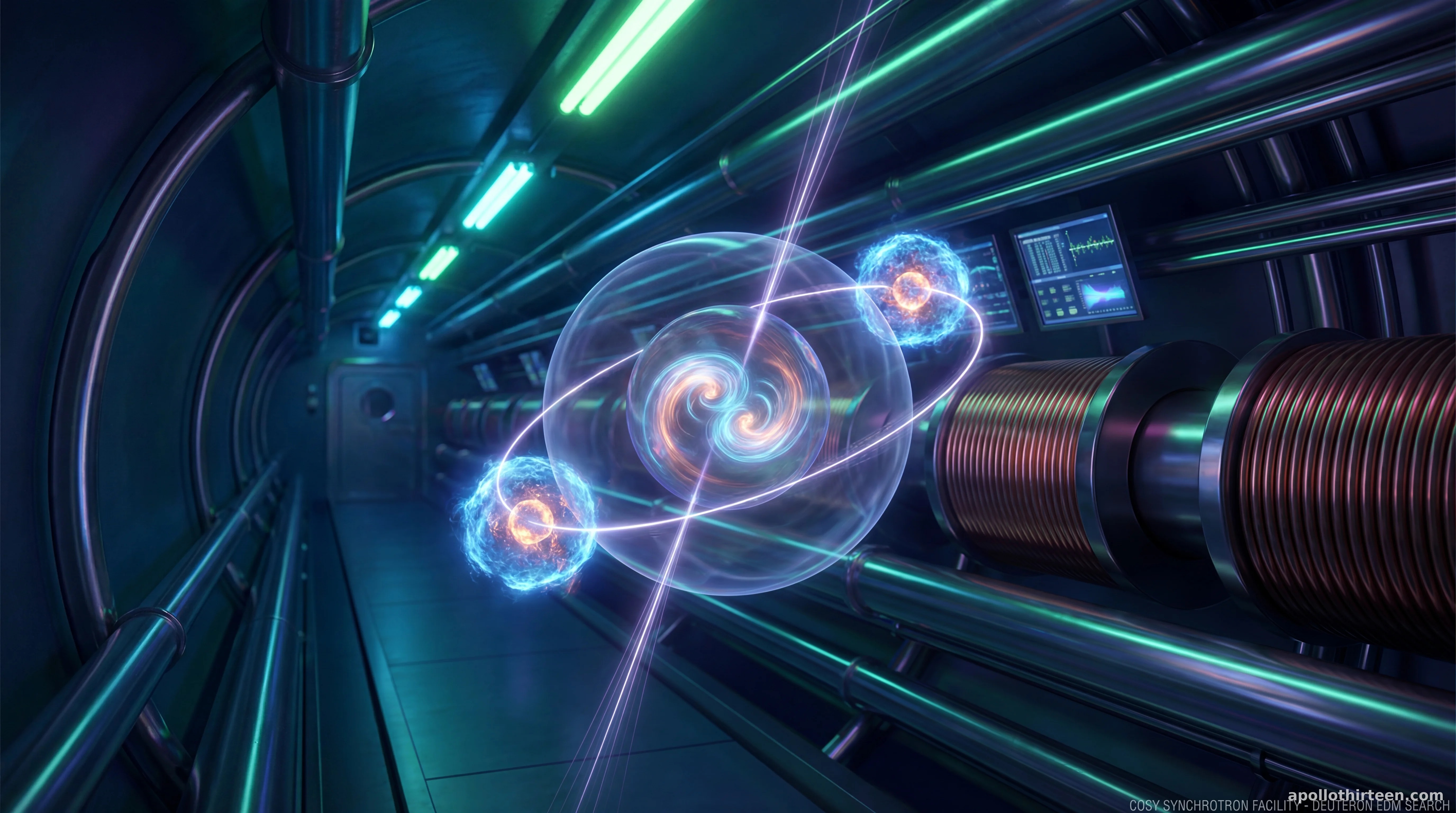 Wetenschappers hebben een belangrijke mijlpaal bereikt in de zoektocht naar de reden waarom ons universum hoofdzakelijk uit materie bestaat in plaats van uit antimaterie. Door de minieme "kanteling" van de spin van het deuteron-deeltje te meten binnen een opslagring, hebben onderzoekers, waaronder A. Andres, A. Aggarwal en L. Barion, de allereerste experimentele limiet vastgesteld voor het elektrisch dipoolmoment (EDM) ervan. Deze ontdekking, gedetailleerd in een nieuwe studie uitgevoerd bij de COoler SYnchrotron (COSY), biedt een cruciale test voor natuurkunde voorbij het Standaardmodel en richt zich op de fundamentele materie-antimaterie-asymmetrie die het bestaan van ons universum mogelijk maakt.