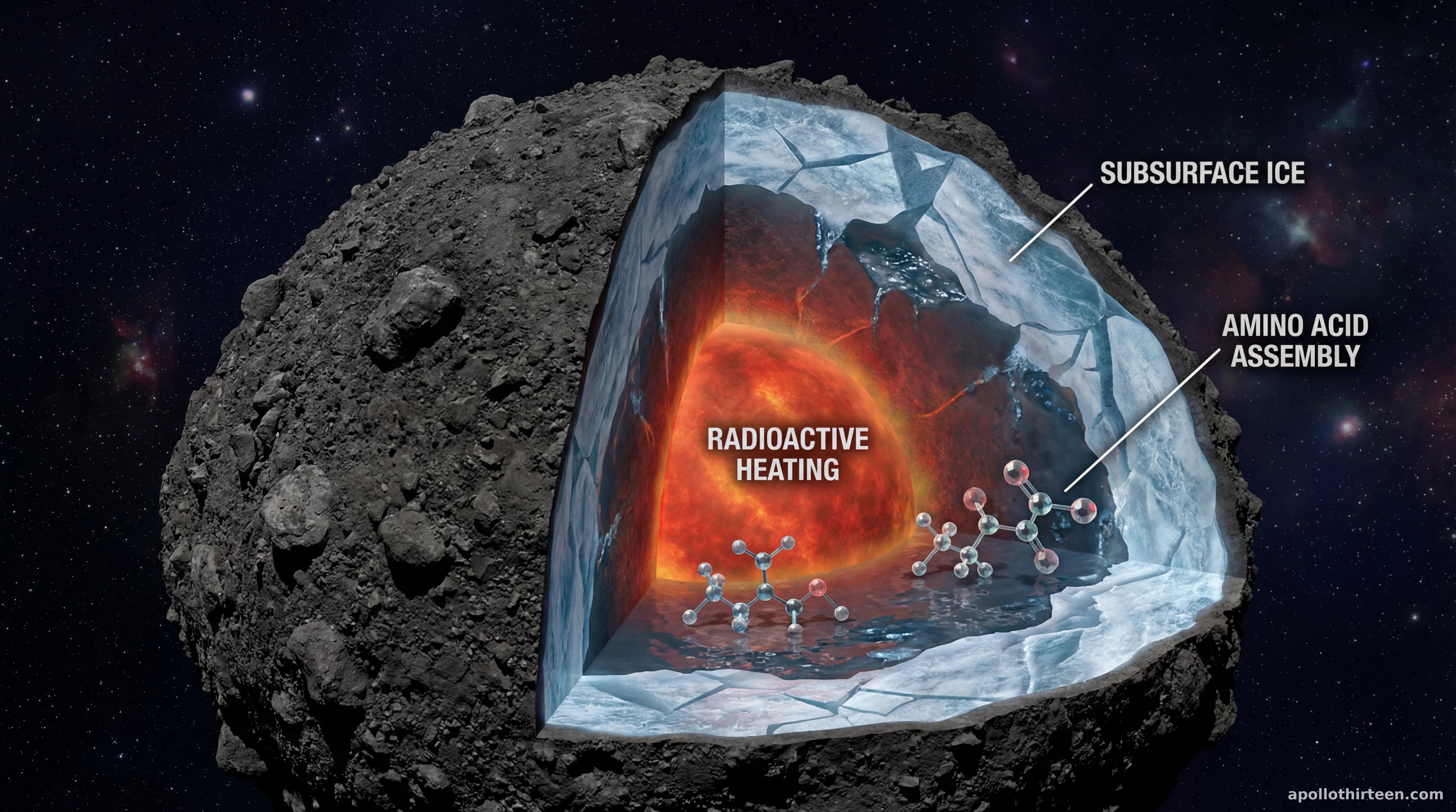 O estudo destaca o papel crítico dos radionuclídeos de vida curta, que forneceram a energia necessária para a síntese química no início do sistema solar. Na ausência do calor solar, o decaimento de isótopos radioativos dentro do corpo pai do asteroide serviu como uma fonte de energia localizada. Essa radiação ionizante interagiu com gelos interestelares — misturas congeladas de água, monóxido de carbono e amônia — para desencadear a formação de orgânicos complexos como a glicina. As principais descobertas em relação a este processo incluem: