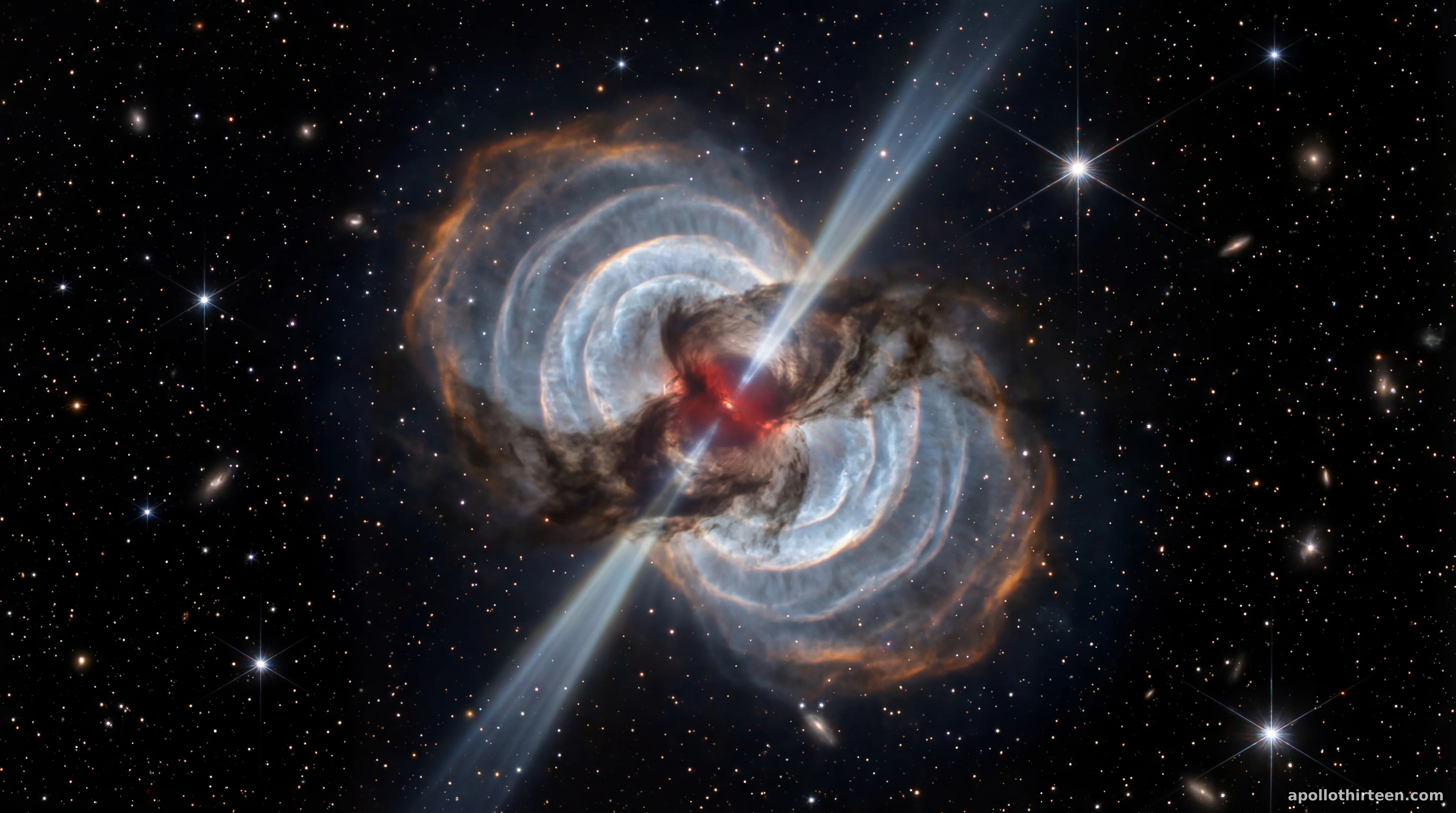 Observações do Telescópio Espacial Hubble sugerem que esses feixes de "holofote" são o resultado de jatos de alta velocidade perfurando uma concha de movimento mais lento de material mais antigo. A simetria e a precisão desses padrões indicam que o processo não é uma explosão caótica, mas uma série coordenada de eventos de ejeção. Os pesquisadores acreditam que esses fluxos se originam do núcleo enriquecido com carbono da estrela agonizante, que falha e libera material em pulsos periódicos ao longo de várias centenas de anos.